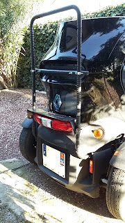 The "rack" module the L-shaped part that allows Letsgo to be either a rack in the lower position, a bike rack in the top position (maximum load: 25 kg), or a rear roof bar (max load: 10 kg). It is very rigid and firmly attached to the base by U bolts.